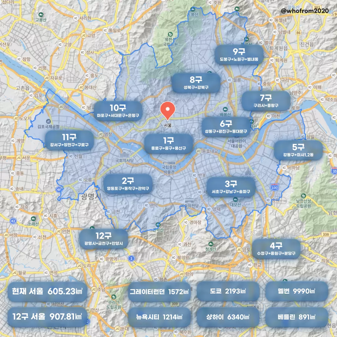 지금 저 위에 12구는 개편안이고 실제 현재 서울의 구는 25개 입니다. 사실 경기도라고 전부 수도권 도시권이라기엔 연천 북단같은데는 수도권이라고 봐야하나 하는 생각도 들거든요.