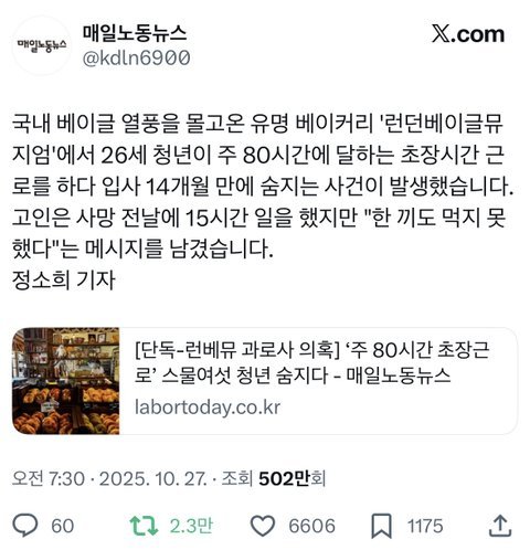 [단독-런베뮤 과로사 의혹] ‘주 80시간 초장근로’ 스물여섯 청년 숨지다 - 2025.10.27 단기·급성·만성근로 해당, 굶으며 하루 15시간 일해 … 회사 근무시간기록 제공 거부, 유족 “청년착취 멈춰야” https://n.news.naver.com/mnews/article/015/0005202788?sid=102 ['MZ 핫플' 빵집 20대 직원 과로사 논란…"주 80시간 근무"] 2025.10.28. (한국경제) https://n.news.naver.com/mnews/article/081/0003585801?sid=102 [“주 80시간 일한 20대 숨져…런던베이글뮤지엄 입사 14개월만”] 2025.10.28. (서울신문) https://n.news.naver.com/mnews/article/053/0000053174?sid=102 ["주 80시간 베이글 굽다 숨졌다"...'오픈런' 명소 런베뮤 비극] 2025.10.28. (주간조선) https://www.fmkorea.com/9084183521 유머x) 런던베이글뮤지엄 20대 과로사 지인입니다. 오늘은 주요 언론들에서도 모두 다루고 있기 때문에 런던베이글뮤지엄의 공식발표를 기다려봐야할 차례죠. 고인의 명복을 빕니다.