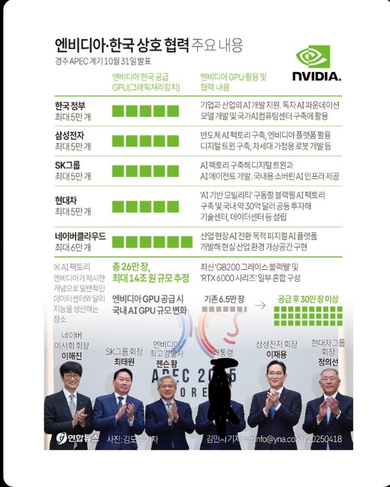 (수정됨) 26만장 확보가 개인적으로 놀랐던게, 엔비디아 공급망에서 대만의 위치를 생각하면 달라는대로 받을 상황인데 지난 5월에 정부 연구소와 NVIDIA가 합동으로 받은 게 1만장이었거든요. 이정도면 한국의 민간이든 공공이든 투자 의지가 강력하니 내준거라 봅니다. 전 처음에 내년 중후반에 나오는 루빈인줄 알았는데, 이미 올해 양산 중인 블랙웰이라고 못박았더군요. 이미 내년까지 물량 완판됐을 텐데 중간에 뭘 어떻게 한건지는 몰라도 중간에서 더 가져온거라 봐야죠. 빅테크보다 먼저 코어위브, 람다 같은 네오클라우드한테 GPU 먼저 배분하는 등, NVIDIA가 의도적으로 생태계 조성에 적극적이라는 점을 고려하면 한국도 소버린 AI 플레이어로 인정해준 것 같습니다.