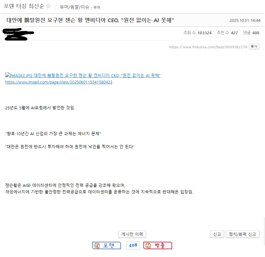 2015년 원자력 31.2% / 석탄 39.3% / LNG 19.1% / 신재생 3.7% 2016년 원자력 30.0% / 석탄 39.6% / LNG 22.4% / 신재생 4.8% 2017년 원자력 26.8% / 석탄 43.1% / LNG 22.8% / 신재생 5.6% 2018년 원자력 23.4% / 석탄 41.9% / LNG 26.8% / 신재생 6.2% 2019년 원자력 25.9% / 석탄 40.4% / LNG 25.6% / 신재생 6.5% 2020년 원자력 29.0% / 석탄 35.6% / LNG 26.4% / 신재생 6.6% 2021년 원자력 27.4% / 석탄 34.3% / LNG 29.2% / 신재생 7.5% 2022년 원자력 29.6% / 석탄 32.5% / LNG 27.5% / 신재생 8.9% 2023년 원자력 30.7% / 석탄 31.4% / LNG 26.8% / 신재생 9.6% 2024년 원자력 31.7% / 석탄 28.1% / LNG 28.1% / 신재생 10.5% 원전이 한 2-3년만에 뚝딱 생기는거면 모를까 재생에너지 왜늘리내고 욕만하면 뭐가 달라지나 싶죠. 젠슨황이 저런말을 하는 배경엔 대만은 2025년 현재 원전이 1기도 돌아가고 있지 않기 때문일겁니다.