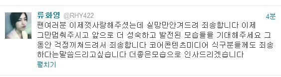 오유 보니까 다른 화영의 글에는 "" 나 . , 등이 사용되어 있는데 저건 딱 글만 써져 있다고 말하는 분도 계시네요. 진짜 광수 사장이 불러준 대로 적거나 로그인만 하고 다른 사람이 쓴듯....