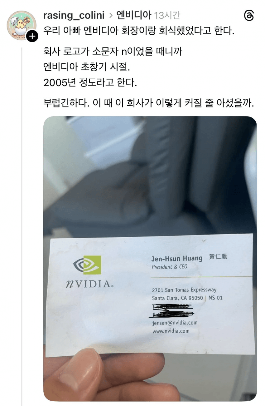 520619 [기타] "젠슨 황, 오늘날 엔비디아 만든 게 대한민국이라고 말해" [34] 전기쥐4439 25/10/31 4439
