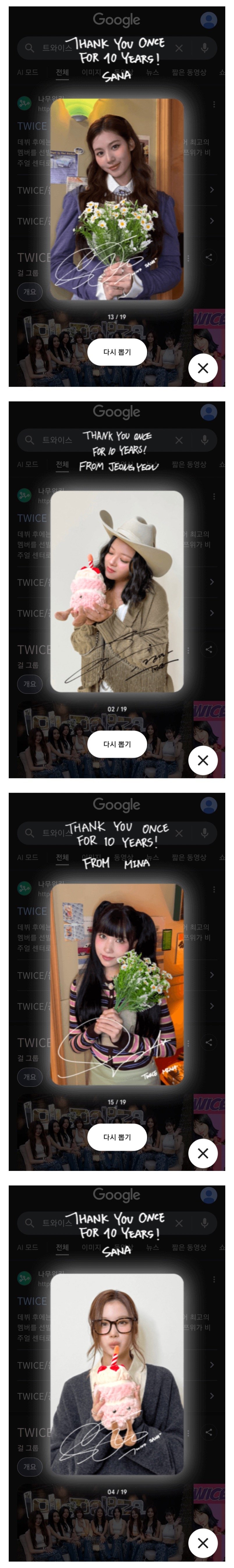 지금 구글에서 트와이스를 검색하시면 데뷔 10주년 포토카드를 보실 수 있습니다!