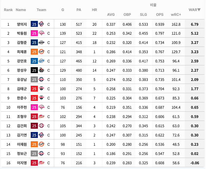 스탯티즈 표는 규정타석을 30% 이상 소화한 포수들 리스트입니다.