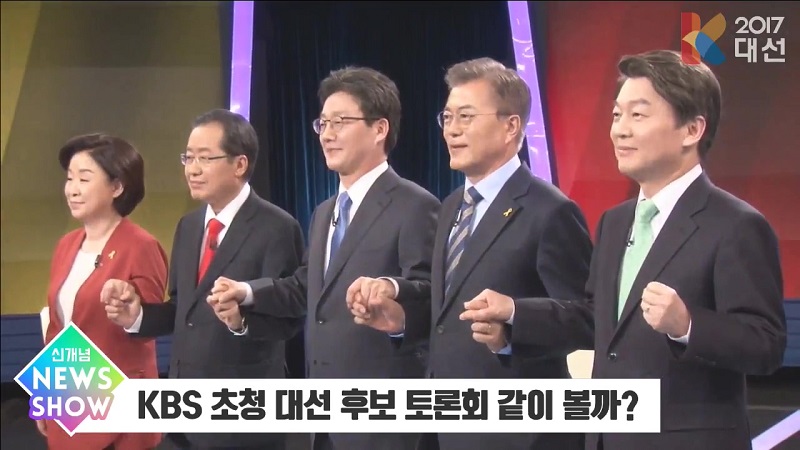 룰부터 사회자의 토론운영까지 그냥 특정후보 다굴치기 위해 짜여진 판이죠 주제에 관계없는 공격적인 질문도 방관하고 후보의 발언순서나 발언권도 지맘대로 토론회 룰자체도 한 후보가 집중공격받기 쉬울뿐더라 답변자체도 시간을 소모하기때문에 제대로 발언권을 쓰지도 못합니다 캢 클라스 잘봤습니다