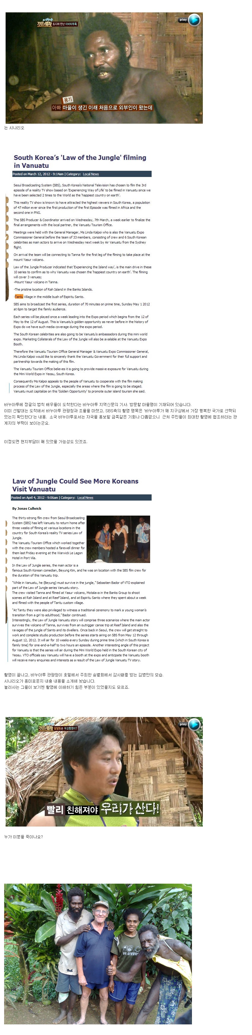 2. 바누아투 지역신문에 정글의법칙 기사가 떴다는 사실과 김병만이 감사패를 받았다는 사실에 대해서