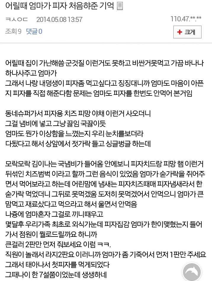 아버지는 시골 집안 6남매 중 막내로 태어나셨고, 공부가 너무 하고 싶으셨지만 지원을 받을 수 없었습니다. 대학교를 가겠다는 일념으로 무턱대고 상경해서 가족, 친척에 손벌리고 눈칫밥 먹어가며 삼수까지 하셨지만 결국 실패하고 맨손으로 사회에 뛰어드셨죠. 군대를 갔다오시고 어머니를 만나 결혼하신 후 저를 낳은 뒤 이전에 살고 있던 단칸방의 잘못된 계약 때문에 방에서 나가야 했고, 2월 겨울에 서울 어떤 산 속 건물에 딸린 작은 창고를 얻어 살림을 차리셨습니다. 그런데 이사할 때 가구를 넣기에 문의 폭이 비좁아서 어쩔 수 없이 뜯었던 창문을 다시 붙일 수가 없어 임시방편으로 창문에 비닐을 여러 겹 붙여놓았다고 합니다. 그 한겨울 추운 산 속에서 그런 집에서 밤에 잠이 올 리가 없죠. 이사한 날 너무 추워서 어린 제가 잠을 자지 못하고 앵앵 울었다고 합니다. 부모님은 저를 껴안고 같이 엉엉 우셨고, 불쌍한 가족은 그 추운 밤을 버텨내었지요. 그 후에 아버지께서 오토바이 하나로 우유배달, 신문배달 등으로 돈을 모아 지인과 시작한 작은 사업은 사기를 당해 망해버렸습니다. 지방으로 내려가 다시 처음부터 시작하셨는데, 부모님은 그 없는 생활에도 저는 뭐 하나 부족함 없이 키우려고 노력하셨습니다. 옷도 가능하면 좋은 걸 입히시고, 생일선물로 1990년대 중반쯤 당시 동네 문구점에 있던 10만원을 호가하던 레고 제품이 생일 선물로 갖고 싶다고 조르던 저에게 기꺼이 사주시던 것도 기억나네요. 하지만 피자를 한 달에 끽해야 한 번 허락받아 먹을 수 있었으니 역시 생활이 그리 좋진 않았겠지요. 그런 사정도 모르고 친척 모임 때 리조트에 놀러가서 피자를 먹을 일이 있었을 때, 게걸스럽게 먹는 저에게 어머니께서 누가 보면 굶기는 줄 알겠다고 말하자 "안 시켜주잖아!!" 하고 철없이 따지던 제가 생각나네요. 그 때 아무 대답이 없던 부모님 모습이 지금에서야 너무 안타깝습니다. 참고로 지금도 아버지가 정말 좋아하시는 음식 중 하나는 피자입니다. 어릴 적엔 어머니는 저희 형제를 열심히 가르치고 챙겨주시는 이미지였던 반면 아버지는 평소에는 무뚝뚝한 편이셔서 저희에게 별 관심이 없어 보였고 항상 밤 늦게 들어와서 주무시거나 가끔 담배 냄새, 술 냄새 풍기고 수염 가득한 얼굴을 부비며 술주정하는 분이었는데 지금 생각하면 얼마나 삶에 여유가 없었으면, 얼마나 많은 고생을 하고 계셨으면 그랬을까 싶어 눈물이 납니다. 다행히도 지금은 많이 여유를 가질 정도로 집안 사정이 좋아졌고 저 역시 재수 후 좋은 대학에 입학했습니다. 합격 당시엔 부모님께서, 특히 아버지께서 그렇게 좋아하시는 이유를 몰랐는데 아버지께서 말하시길 당신이 못 이룬 꿈을 제가 대신 이뤄준 셈이니 어떻게 안 기쁠 수 있겠냐는 얘기를 듣고 가슴이 뭉클하더군요. 성격이 무뚝뚝해서 마음은 안 그러면서도 표현을 안 했는데, 언제 한 번 집에 찾아가 술 한잔 하면서 부모님께 사랑한단 얘기를 하고 싶습니다.
