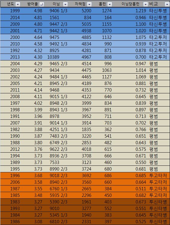 우리나라 타자들 수준이 너무 떨어지긴 한것 같아요....아무리 투고타저라고 해도 1점대가 6명이나 나오는건 좀 심하긴 하네요. 그리고 인터넷에서 많이 보이는 글중에 선동열이 상대적으로 투구이닝수가 좀 적었다는 말은 어떤가요?