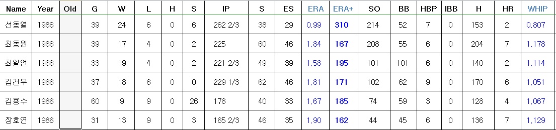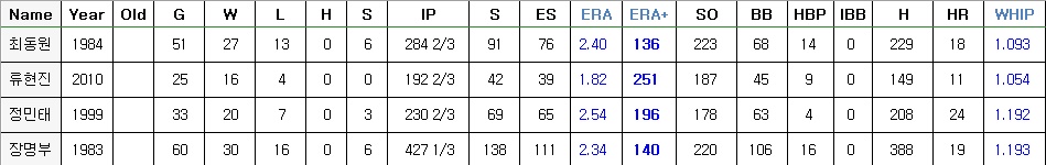 다른 선수들 살펴봤는데 이 시즌외에 다른 시즌을 살펴봤을때 확실히 선동열이 독보적인건 맞는것 같네요. 다만 최동원만큼은 별개로 쳐야할것 같습니다. 혹사 당했다는건 유명해서 알았지만 이 정도일줄은 몰랐네요.