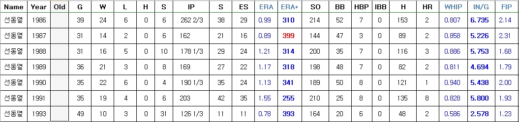 물론 당시에는 지금처럼 선수들의 실력차가 평준화되지 않았고 다소 극심하긴 했습니다만 선동열은 그냥 리그 수준 자체를 초월했다고 봐야 하는거 같습니다. 이런 경우에는 사실 기록이 크게 의미가 없죠. 류현진도 KBO에서는 기록이라는게 의미가 없는 선수였구요.