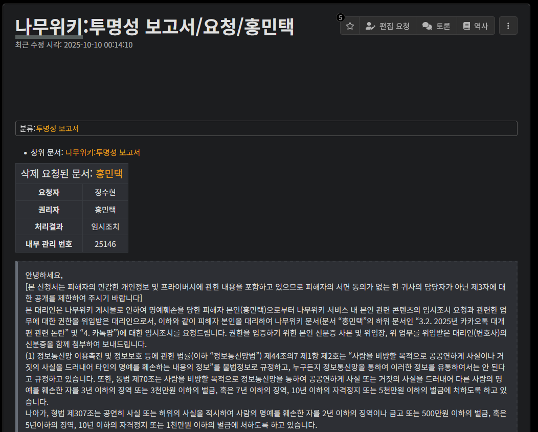 520009 [기타] 나무위키 홍민택, ~~카톡팝~~ 문서 임시조치 [34] 우스타6255 25/10/10 6255